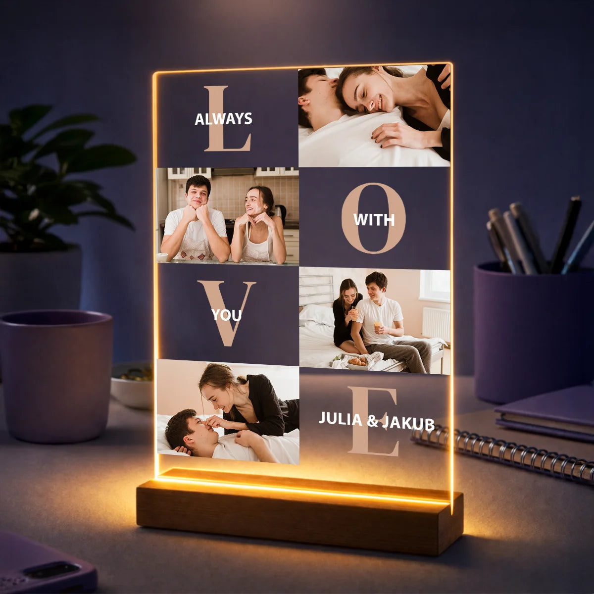 Oryginalny prezent dla pary na rocznicę – kolaż z 4 zdjęć na szkle z imionami i napisem Love with you
